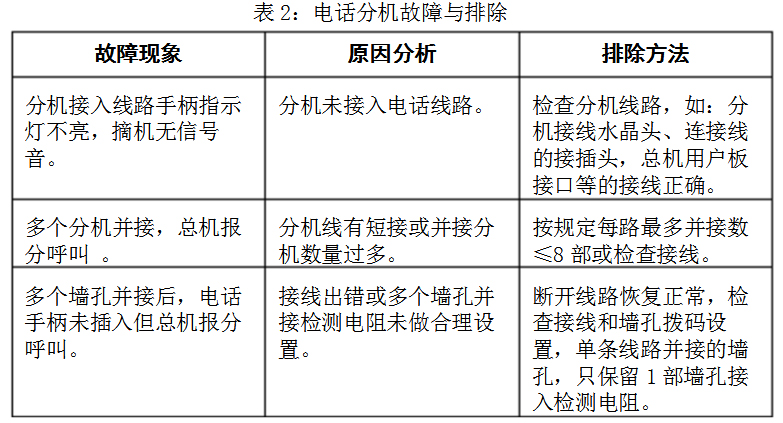 2 電話分機故障與排除見表2: